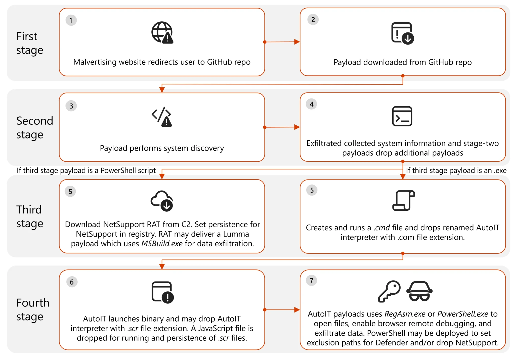 "În funcție de încărcătura utilă al stagiului secund, fie unul sau mai multe executabile sunt aruncate pe device-ul compromis, câteodată și cu scripturi Powershell însoțitoare criptate" au scris cercetătorii Microsoft joi. "Aceste fișiere inițiază un lanț de evenimente care conduc execuția de comenzi, livrarea de încărcături, evaziunea apărării, persistare, comunicații C2 și extragerea datelor."
